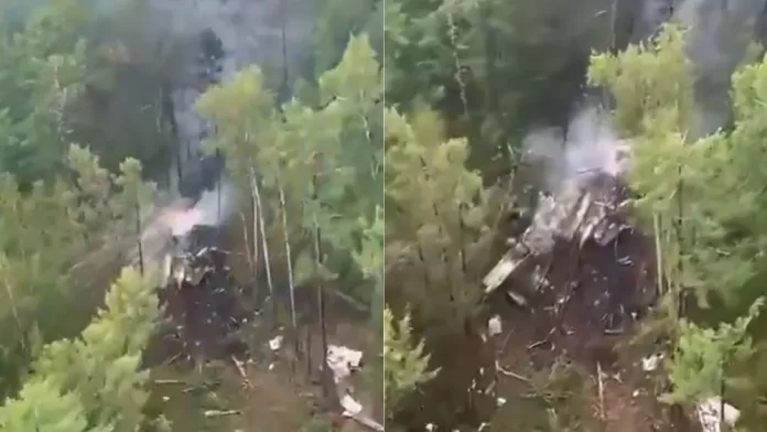 A fuselagem em chamas do avião, que era da era soviética e tinha quase 50 anos, foi avistada no solo por um helicóptero e equipes de resgate correram para o local.