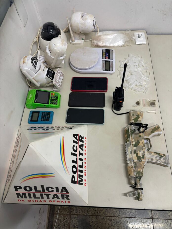 Ao chegarem ao endereço na Rua Jequeri, Bairro Centro, os militares visualizaram dois suspeitos na porta de um imóvel. Ao receberem voz de abordagem, os autores fugiram para dentro da residência e depois escaparam por um beco interno. Durante buscas autorizadas no imóvel, a PM apreendeu diversos materiais relacionados ao tráfico, incluindo drogas, balança de precisão, embalagens, rádios comunicadores, celulares, câmeras de segurança e um simulacro de arma de fogo.