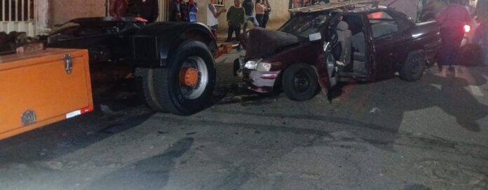 Por volta das 22h20,do sábado, 2/08 um veículo de passeio colidiu violentamente contra uma carreta que estava estacionada na via.