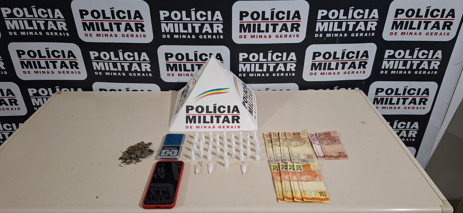 Dando continuidade às diligências, foram localizadas 33 porções de cocaína, 1 porção de maconha, 1 balança de precisão e R$ 300,00 em dinheiro.