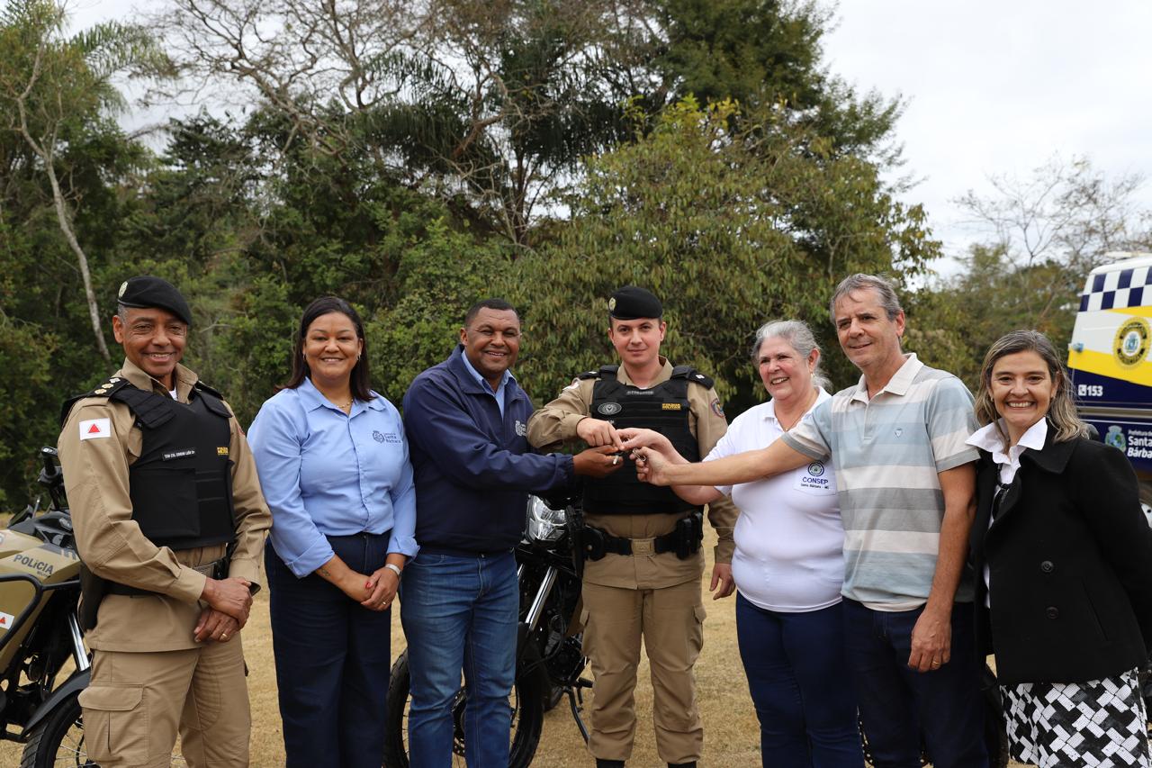 As chaves das viaturas foram entregues pelo prefeito Alcemir Moreira e pela presidente do CONSEP, Fátima Conceição Rosário, ao Tenente Vinícius Nunes Silva, Comandante do Pelotão da Polícia Militar de Santa Bárbara.