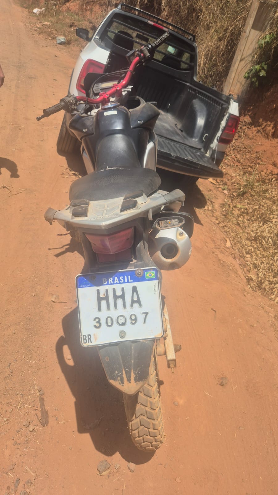 Durante realização de operação Batida Policial, na manhã da sexta-feira(3) na Comunidade de Barbosa, zona rural de Bela Vista de Minas/Mg, ao passar pela “Fazenda Engenho”, a Policiais  Militares do Meio Ambiente  avistaram a motocicleta Honda/ XRE 300, estacionada numa coberta e a placa do veículo chamou a atenção dos militares, sendo HHA-30Q97, modelo fora dos padrões nacionais e Mercosul.