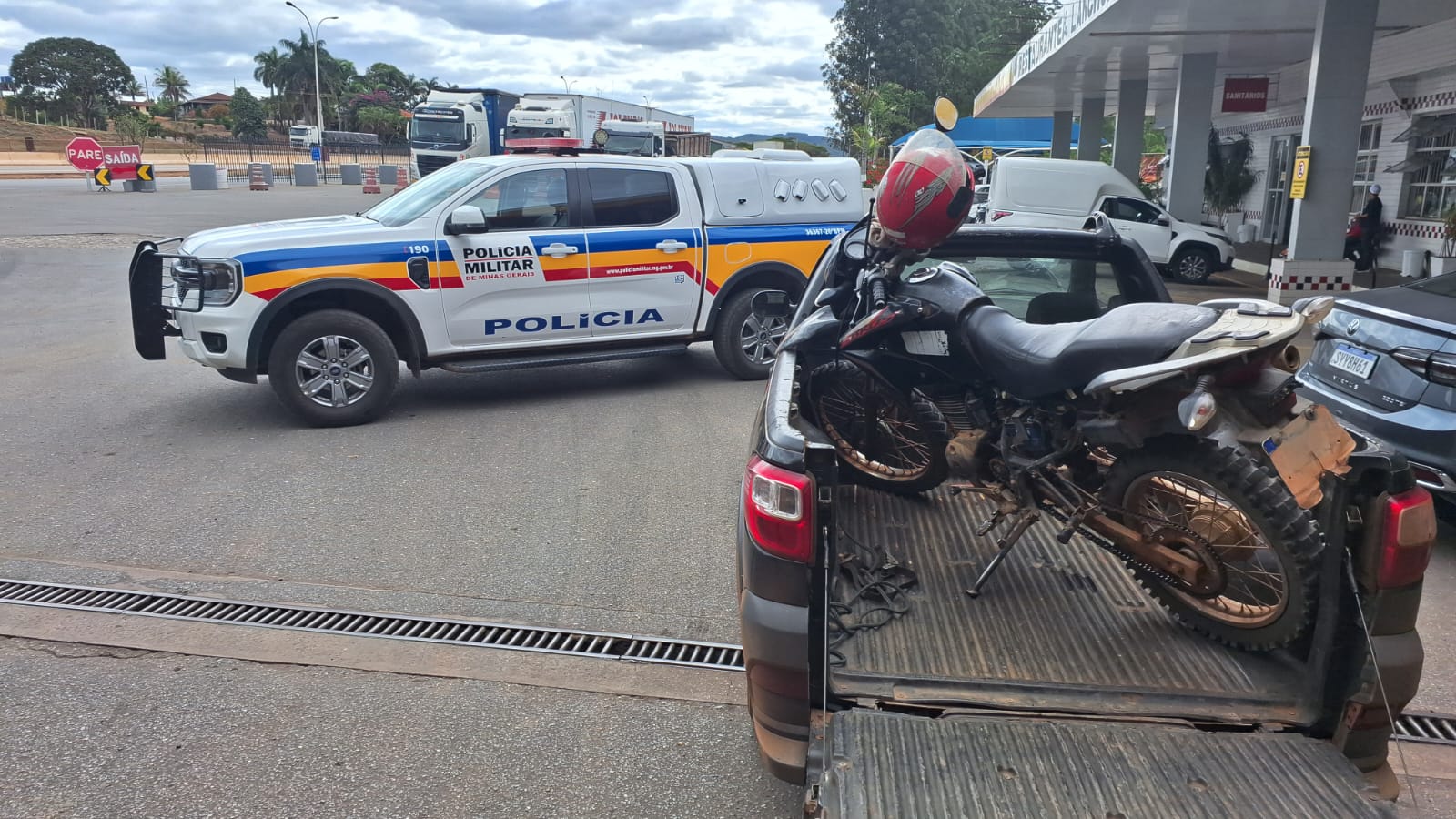 No dia 21/10/2025, por volta das 13h, a Polícia Militar localizou uma motocicleta Honda NXR 150 Bros, de cor preta, no pátio de um posto de combustíveis situado na BR-381, km 399, em Bom Jesus do Amparo.