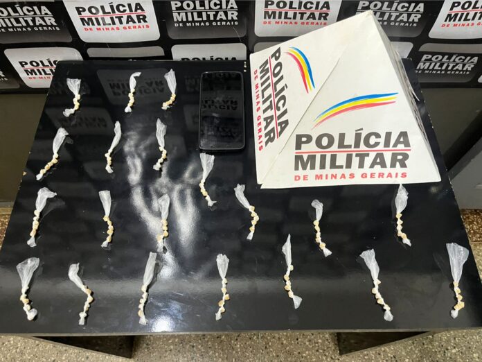 Durante a aproximação, os militares visualizaram o suspeito, de 24 anos, arremessando um invólucro para o interior de uma residência e fugindo em seguida, deixando cair um aparelho celular.