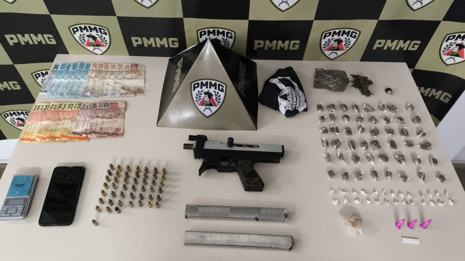 Um dos autores, que estava portando arma de fogo, foi alvejado na perna durante a intervenção policial, após desobedecer a ordem dos militares e apontar a arma de fogo na direção da equipe. Em seguida, houve êxito na abordagem e prisão de outro autor, sendo encontrado todo o material aprendido acima relacionado.