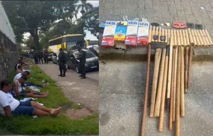 Foi realizada uma vistoria no interior do coletivo e, durante as buscas, os agentes localizaram diversos materiais que seriam utilizados nas brigas, como soco-inglês, bastões de madeira, pedras e bombas caseiras. Os envolvidos foram liberados e o caso foi encaminhado para as autoridades competentes para que as investigações. Eles ainda terão que prestar depoimento na Delegacia de Polícia em Monlevade para que a investigação apure os fatos.