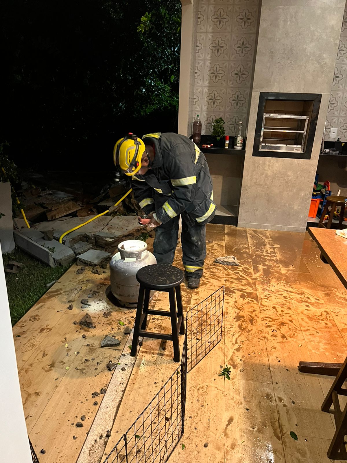 Com a queda, destroços acabaram danificando parte de uma fiação elétrica e uma mangueira com registro do botijão de gás, que foi isolado e colocado em local seguro.